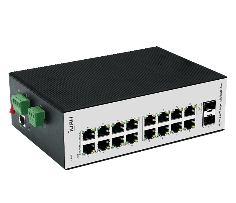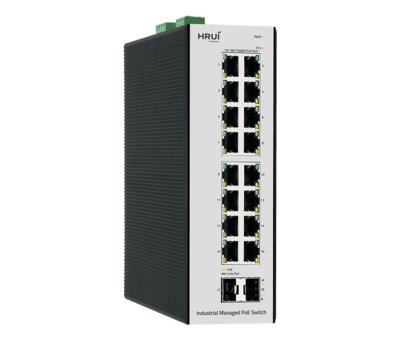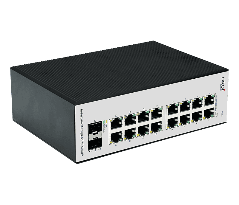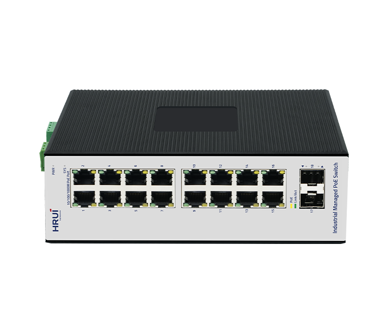 The HR722P-16T2GS is an 18-port industrial-grade managed PoE switch designed for harsh environments, featuring 16×1Gbps PoE ports (IEEE 802.3af/at) and 2×1Gbps SFP slots. With a 36Gbps switching capacity, -40~55°C operating range, and IP40 rugged aluminum housing, it ensures reliable connectivity for critical applications. Advanced L2+ features like VLAN, QoS, and SNMPv3 enhance network security and management, while dual redundant power inputs and 6KV surge protection guarantee uninterrupted operation.